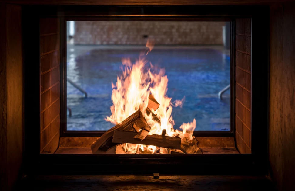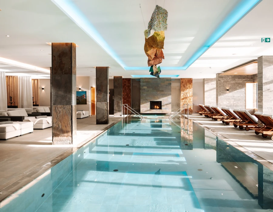 - 16,5 m langer Indoor-Pool mit Kaminlounge