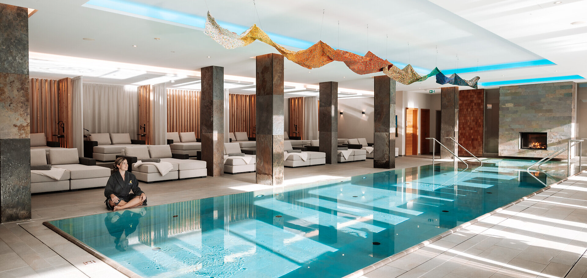 Während der Blick der Gäste tief in das eigene Wohlergehen reicht, richtet er sich auch auf die Schönheit der Bayerischen Landschaft. Helle Glasfassaden und Fensterfronten bringen die Bergwelt, Wiesen und Wälder hinein ins innere unseres Wellnesshotels. Drinnen herrscht Ruhe und ist Raum für Rückzug: Ob im Indoor-Pool, in den Saunen, bei den Körper- und Beauty-Behandlungen oder im einzigartigen Alpen Soledom, wo man Schwerelosigkeit im heilenden Solebecken genießen kann.