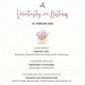 Tauchen Sie ein in eine Welt der Liebe und Leidenschaft mit unserem exklusiven Valentinstags Dinner im Hotel Klosterhof Bayerisch Gmain. Verwöhnen Sie Ihre Sinne mit einem unvergesslichen Abend voller kulinarischer Höhepunkte und romantischer Atmosphäre.